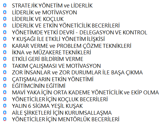 Etkin yönetim ve liderlik becerilerinizi, yeni yaklaşımlarla geliştirip, destekleyecek eğitim konuları sunuyoruz.