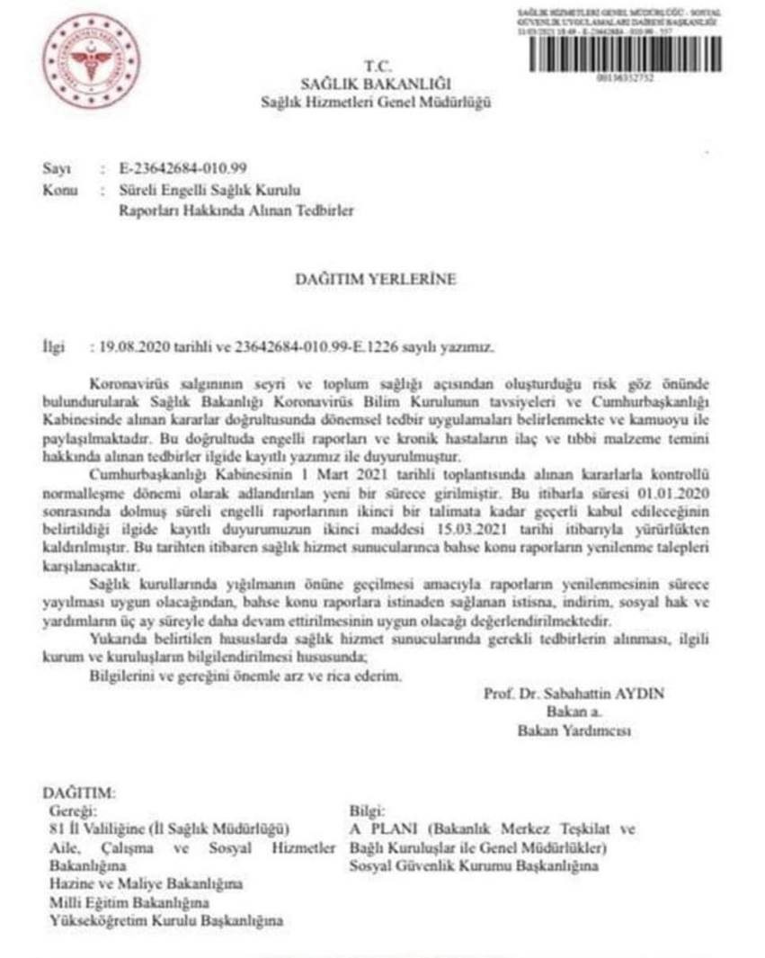 • 01.01.2020 sonrasında dolmuş süreli engelli raporları ikinci bir duyuruya kadar geçerli sayılmıştı.