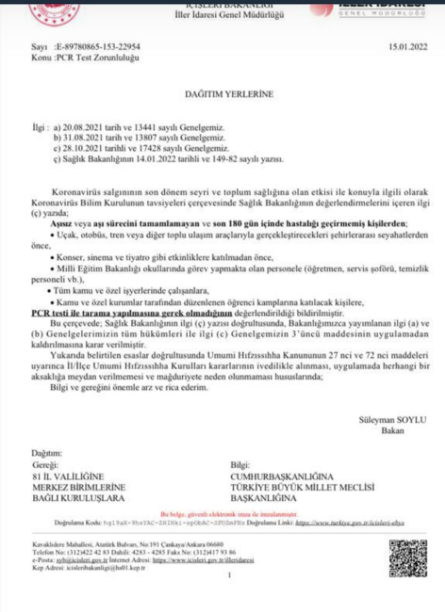 Bülten Kayıt Formu12 Ocak 2022 Tarihinde Bilim Kurulu tarafından alınan kararlar doğrultusunda 2022-08 sayılı Bültenimiz ile “Üçüncü maddede yer alan durumun, işyerlerine girişte çift doz aşı veya negatif PCR testi zorunluluğu açısından uygulama sorunu çıkarabileceği aşikardır. Bulaşma ve yaygınlık seviyesi dikkate alındığında, Çalışma ve Sosyal Güvenlik Bakanlığı tarafından genelgenin geri çekilebileceğini, bu sebeple işyerlerinde söz konusu durumun esnekleşebileceğini öngörmekteyiz.” Olarak belirtmiştik.