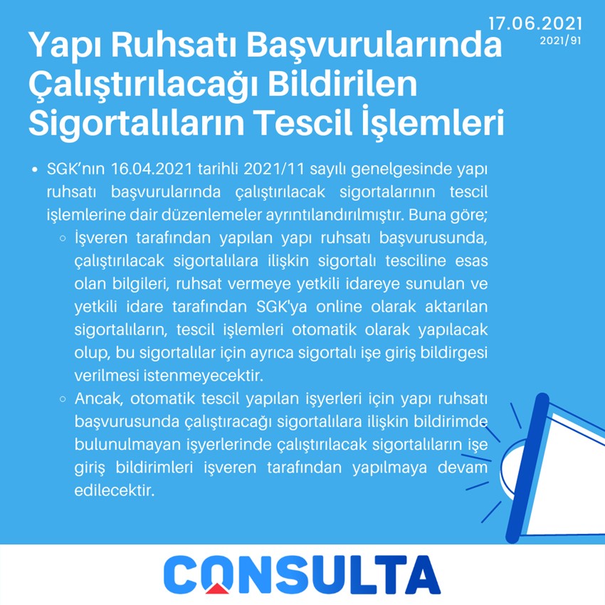 - SGK'nın 16.04.2021 tarihli 2021/11 sayılı genelgesinde yapı ruhsatı başvurularında çalıştırılacak sigortalarının tescil işlemlerine dair düzenlemeler ayrıntılandırılmıştır. Buna göre;