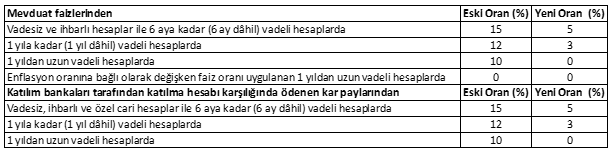 Bülten Kayıt Formu30.09.2020 tarih ve 31260 sayılı Resmi Gazete’de yayımlanan 3032 sayılı Cumhurbaşkanı Kararı ile mevduat faizi ve katılma hesabı kar payı tevkifat oranlarında geçici bir süre için indirime gidilmiştir. Söz konusu değişikliğin önemli unsurları aşağıda maddeler halinde belirtilmiştir.
